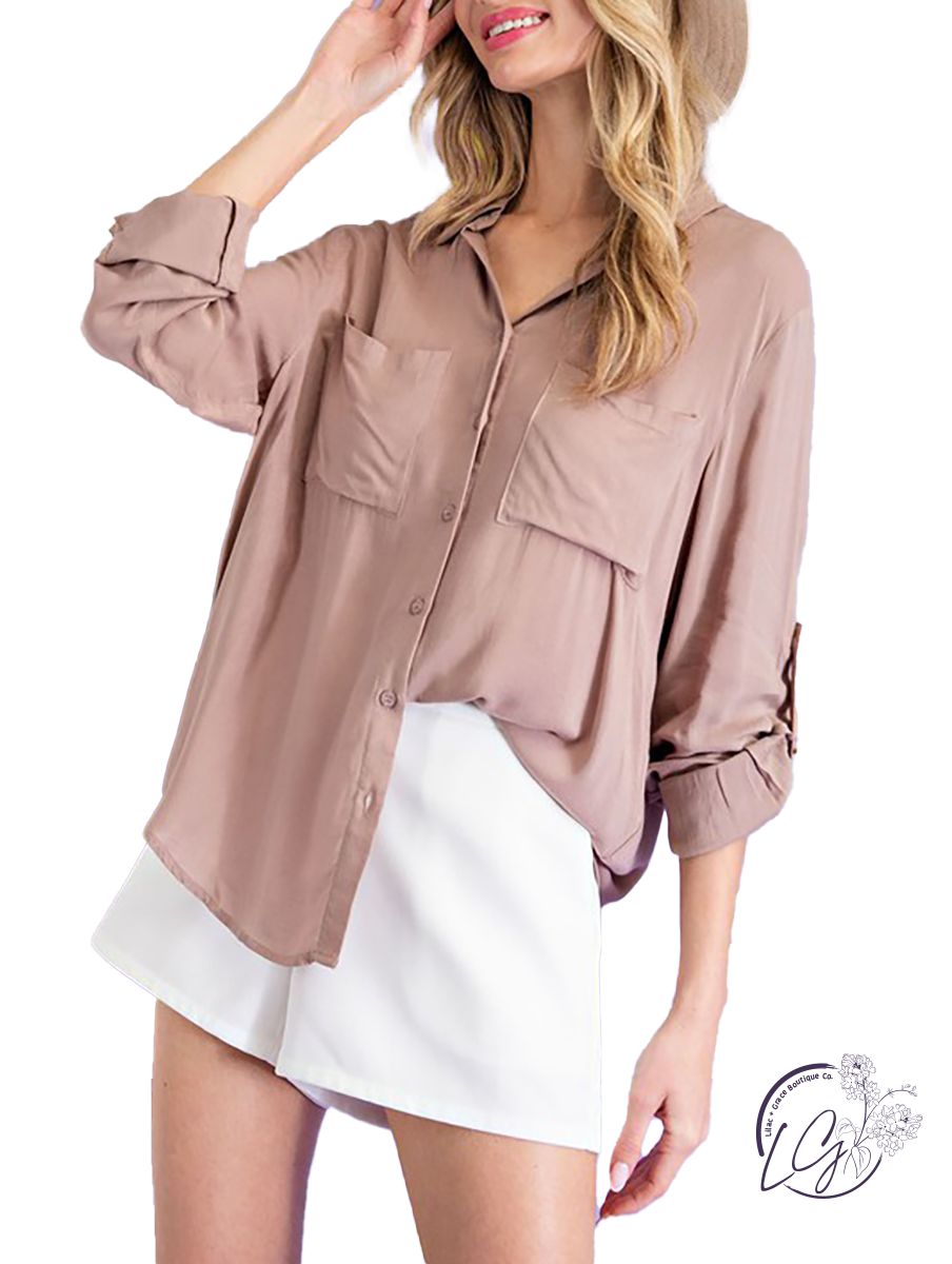 Essential button down top with long roll tab sleeves, pointed collar, and front pockets.